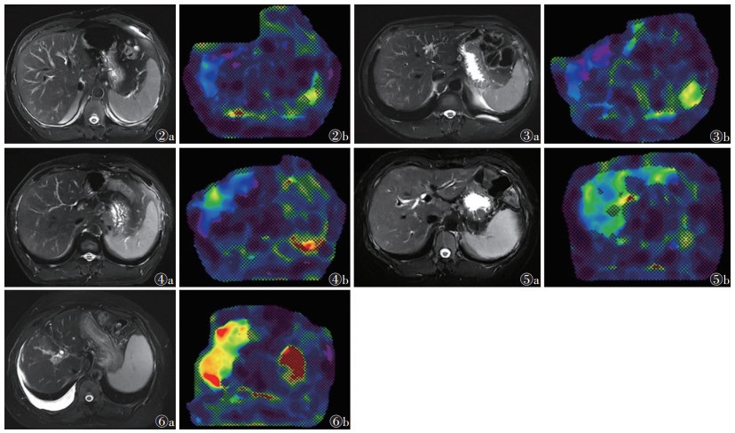 | 注:图2患者,男,36岁。图2a,2b分别为脂肪抑制T2WI和肝脏磁共振弹性成像(MRE),弹性值为2.24 kPa(F0期),透明质酸(HA)为42.13 μg/L,层粘连蛋白(LN)为39.86 μg/L,Ⅲ型前胶原肽(PCⅢ)为4.2 μg/L,Ⅳ型胶原(CⅣ)为18.10 μg/L。图3患者,男,54岁。图3a,3b分别为脂肪抑制T2WI和肝脏MRE,弹性值为2.50 kPa(F1期),HA为84.70 μg/L,LN为67.10 μg/L,PCⅢ为14.10 μg/L,CⅣ为34.70 μg/L。图4患者,男,41岁。图4a,4b分别为脂肪抑制T2WI和肝脏MRE,弹性值为2.72 kPa(F2期),HA为97.50 μg/L,LN为84.87 μg/L,PCⅢ为10.65 μg/L,CⅣ为41.36 μg/L。图5患者,男,46岁。图5a,5b分别为脂肪抑制T2WI和肝脏MRE,弹性值为3.26 kPa(F3期),HA为114.90 μg/L,LN为76.70 μg/L,PCⅢ为28.70 μg/L,CⅣ为51.00 μg/L。图6患者,男,68岁。图6a,6b分别为脂肪抑制T2WI和肝脏MRE,弹性值为5.25 kPa(F4期),HA为531.90 μg/L,LN为115.30 μg/L,PCⅢ为20.70 μg/L,CⅣ为226.80 μg/L 图 2-6 慢性乙型肝炎患者的MRI图像 |