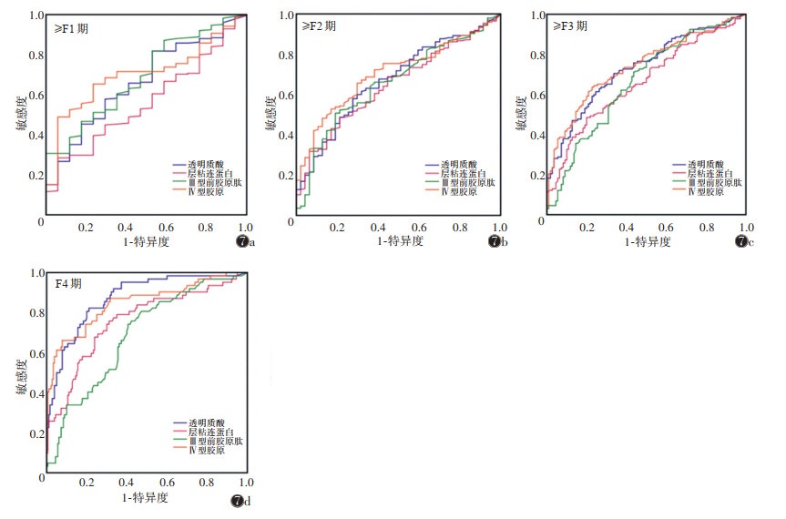 | 注:图7a为诊断≥F1期;图7b为诊断≥ F2期;图7c为诊断≥ F3期;图7d为诊断F4期 图 7 肝纤维化血清学指标诊断不同肝纤维化分期的ROC曲线 |