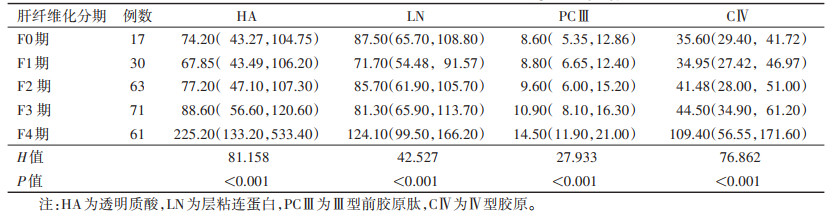 | 表 1 不同肝纤维化分期肝纤维化血清学指标比较[μg/L,M(QL,QU)] |