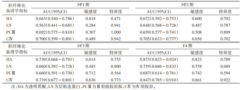 | 表 2 肝纤维化血清学指标在不同纤维化分期诊断中的ROC曲线分析结果 |