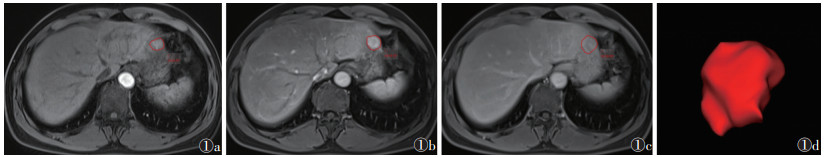 | 注:图 1a~1c分别为动脉期、门静脉期、延迟期沿病灶边缘勾画ROI,图 1d为病灶分割图 图 1 肝细胞癌ROI勾画示意图 |