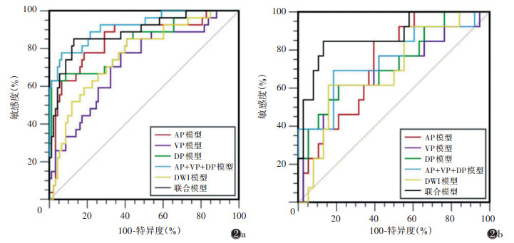 | 注:图 2a为训练集,图 2b为验证集,AP为动脉期,VP为门静脉期,DP为延迟期 图 2 不同模型预测肝细胞癌(HCC)患者CK19表达水平的ROC曲线 |