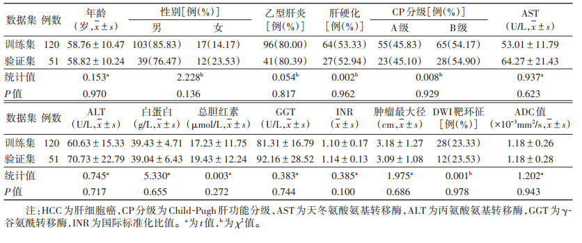 1 资料与方法 1.1 一般资料回顾性收集2017年1月至2024年8月在温州医科大学附属第五医院治疗的HCC患者。纳入标准:①均行根治性切除术并经病理证实为单发HCC;②术前1个月内行肝脏MRI检查;③行免疫组织化学检测CK19表达情况;④无其他恶性肿瘤;⑤病灶最大径≤ 5 cm。排除标准:①MRI图像质量不佳或缺失;②术前行抗肿瘤治疗;③临床资料不完整。最终纳入171例,其中男142例,女29例;年龄25~86岁,平均(58.78±10.37)岁。171例按7∶3的比例随机分为训练集120例和验证集51例。本研究通过医院伦理委员会批准[批号:科研伦理2024(I)第074号(批)-01]。