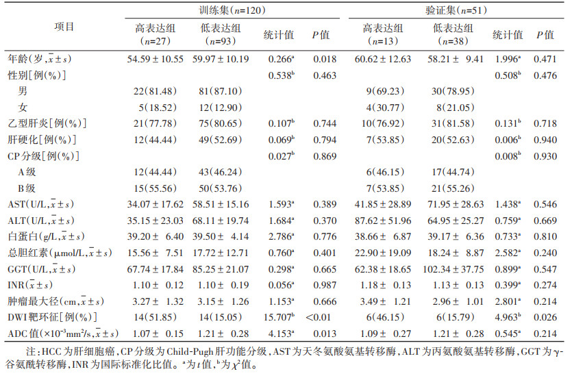 1.2 CK19检查对所有组织标本行切片及免疫组织化学CK19染色。CK19判读:在光镜下每张切片随机选取10个200倍视野,每个视野随机观察100个细胞,共计1 000个细胞,在肿瘤热点区域中进行计数,每例患者选取5个高倍镜视野,结果取其平均值。CK19为肿瘤细胞胞质染色,呈淡黄色至棕褐色为阳性。由2位分别具有5、8年诊断经验的病理科诊断医师独立复阅切片,意见分歧时取更高年资医师诊断结果。根据HCC病理学形态学诊断标准区分高/低表达:肿瘤中有中等程度或明显的细胞染色(≥ 5%)为高表达,其余为低表达[7]。训练集120例中,低表达组93例,高表达组27例;验证集51例中,低表达组38例,高表达组13例。