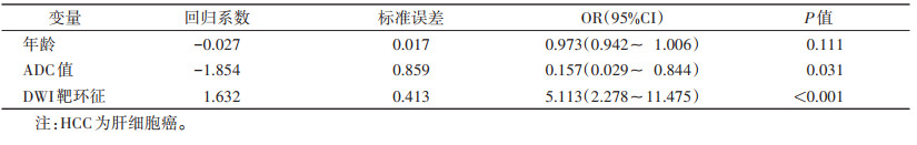 本研究发现,DWI靶环征与ADC值在训练集CK19高低表达组中差异有统计学意义(均P<0.05)。DWI靶环征可能是病灶边缘肿瘤细胞丰富、中央纤维成分较多所致[17]。CK19表达易促进纤维间质增生[4],预示HCC有胆管细胞表型分化倾向,因此该类HCC的组织学特征可介于典型HCC与胆管细胞癌之间[18]。多项研究指出,DWI靶环征可作为是HCC CK19高表达的独立预测因素[18-21]。ADC值通常用于区分肝脏良恶性病变,ADC值较低通常意味着恶性程度可能性更高、细胞增殖活性更强,原因可能是肝脏恶性肿瘤细胞密度大、排列紧密且结构不规则,导致水分子运动受限。Choi等[10]认为,ADC值低可作为CK19高表达的独立危险因素。