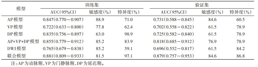 采用AP+VP+DP模型的影像组学特征联合DWI特征构建联合模型,其在训练集和验证集中的AUC分别为0.881和0.879(表 5)。训练集中联合模型的预测效能均明显高于VP模型和DWI模型(均P<0.05),验证集中联合模型的预测效能明显高于DWI模型(P<0.05)。其余模型在训练集及验证集中预测效能差异均无统计学意义(均P>0.05)。不同模型的ROC曲线见图 2。