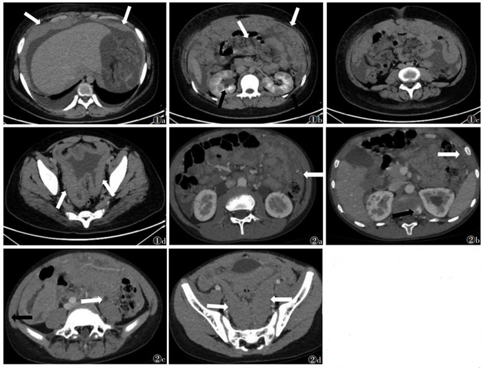 | 注:患者,男,13岁。图1a示腹腔双侧壁腹膜增厚,边缘光滑呈线带状,部分呈扁丘状凸起(白箭);图 1b 示大网膜及肠系膜散在絮状密度增高影,呈污迹样改变(白箭),双肾多发结节样低强化影(黑箭);图1c 示左侧腹部小肠壁增厚并局部团块影,增强扫描后轻度强化(白箭);图 1d示盆腔双侧后壁腹膜梭形增厚,左右环绕直肠,呈“W”样(白箭) 图2 BL的CT增强扫描图像 注:患者,男,9 岁。图2a示大网膜呈饼状增厚(白箭);图2b示肠系膜呈结节状增厚(白箭),双肾多发结节样低强化影(黑箭);图 2c 示右下腹部分小肠壁增厚,增强扫描轻度强化,管腔略扩张(白箭);图 2d示盆腔双侧后壁腹膜梭形增厚,左右环绕直肠,呈“V”样(白箭) 图 1-2 伯基特淋巴瘤(BL)的CT图像 |