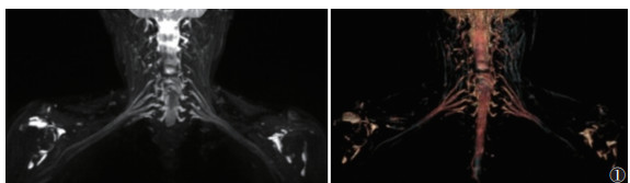 1.2 仪器与方法采用GE SIGNA Pioneer 3.0 T MRI扫描仪和头颈部线圈。患者取仰卧位、头先进,上肢自然放于身体两侧。扫描范围为C1椎体上缘至T3椎体下缘。经肘静脉注射对比剂钆双胺注射液10 mL(浓度287 mg/mL),流率2 mL/s,注射结束5 s后行冠状面3D-STIR Nerve HyperCubeHyperSense序列扫描。扫描参数:TR 2 000 ms,TE 100 ms,TI 260 ms,层厚1.6 mm,层数128,视野46 cm×38 cm,矩阵320×288,体素大小1.0 mm×1.0 mm×1.0 mm,激励次数2.0,扫描时间10 min。