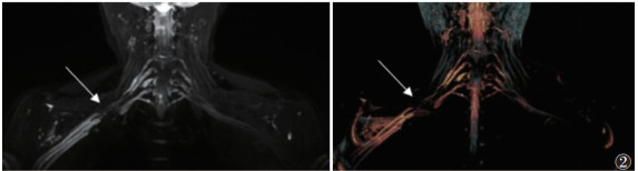 | 注:患者,女,69岁。ceMRN示双侧臂丛神经无异常,但经电生理检查后发现左侧C7~T1神经传导速度减慢,诱发电位波幅降低,为B类损伤 图 1 B类损伤的增强磁共振神经成像(ceMRN) |