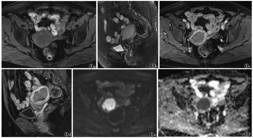 | 图 1 女,56岁,MRI示子宫腔内一大小3.6 cm×3.8 cm×4.4 cm肿块,手术病理证实为子宫内膜腺癌 图 1a T1WI抑脂轴位,肿瘤呈稍低信号,边缘不清 图 1b T2WI抑脂矢状位,肿瘤呈稍高信号 图 1c T1WI抑脂增强轴位,正常子宫肌层明显强化,肿瘤轻度强化呈相对低信号 图 1d T1WI抑脂增强扫描矢状位,肿瘤轻度强化呈相对低信号图 1e DWI示肿瘤呈高信号 图 1f ADC图肿瘤呈低信号,ADC值为0.889× 10-3 mm2/s |
