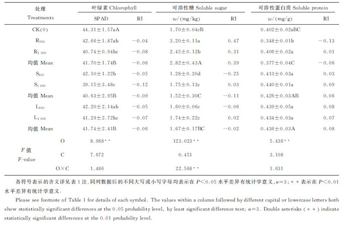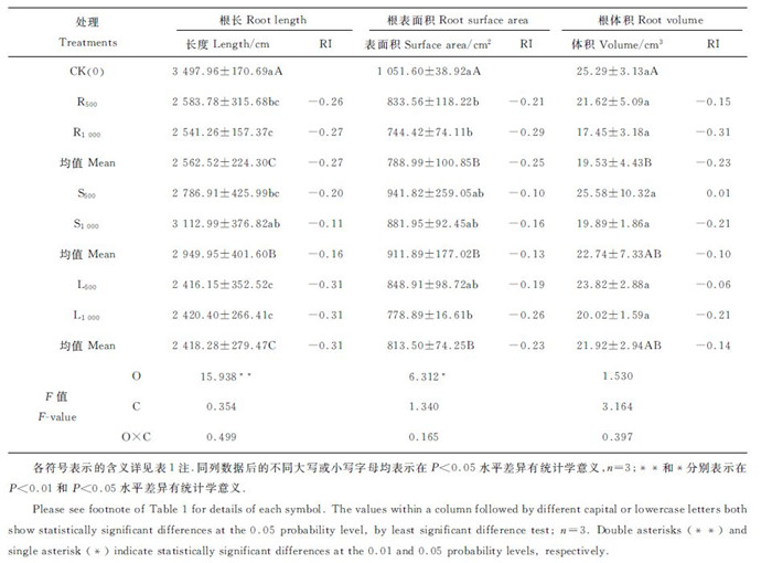 1.3 数据测定与统计分析植株叶绿素含量采用SPAD-502型叶绿素仪测定[16];植株根系形态指标用根系扫描仪(Epson Perfection V700)将根系样品扫描成图片文件,再用WinRHIZO根系分析软件(Epson Expression 1 000 xl)测定根系长度、根表面积、根体积、根尖数以及平均直径和分叉数。植株叶片生理指标根据蔡庆生的方法[17]测定:过氧化物酶(peroxidase,POD)采用氮蓝四唑(nitro-blue tetrazolium,NBT)还原法测定;过氧化氢酶(catalase,CAT)采用紫外吸收法测定;丙二醛(malondialdehyde,MDA)采用硫代巴比妥酸法测定;可溶性蛋白质采用考马斯亮蓝G-250法测定;可溶性糖采用蒽酮比色法测定。化感效应指数(allelopathic response index,RI)=1- C / T ( T ≥ C )或RI= T / C -1( T < C )。其中: C 为对照值; T 为处理值;RI>0为促进作用,RI<0为抑制作用,其绝对值的大小代表化感作用的强弱[18]。