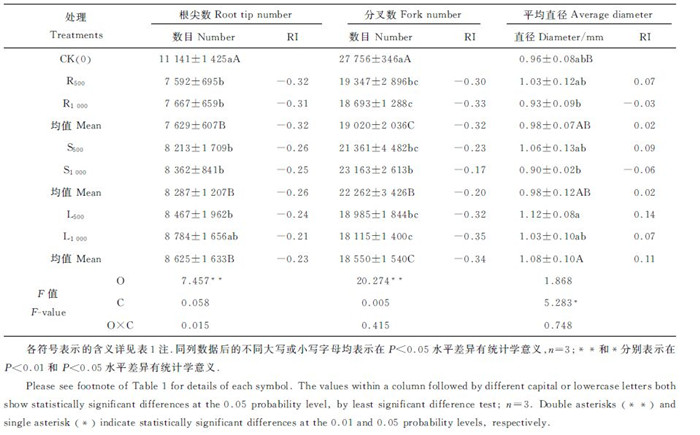 马铃薯浸提液对根系具有抑制作用(表 2,表 3)。不同器官浸提液对根长、根尖数及分叉数的影响达到极显著水平( F =15.938**,F =7.457**,F =20.274**),对根表面积的影响达到显著水平( F =6.312*);而浸提液质量浓度仅对根的平均直径产生影响( F =5.283*)。与对照相比,马铃薯根浸提液对根表面积、根体积、根尖数抑制作用最强,分别降低了24.97%、22.78%和31.52%,RI值达-0.25、-0.23和-0.32;叶浸提液对根长、分叉数的抑制作用最强,降幅为30.87%和33.17%,化感效应指数分别为-0.31、-0.34。马铃薯浸提液对根的平均直径影响小,但其质量浓度对根平均直径的影响达显著水平,且随着浸提液质量浓度的增加,抑制作用有所增强。由此可知,马铃薯不同部位浸提液对根系影响很大,尤其以根浸提液对根系的抑制作用最为显著。说明自毒物质通过对马铃薯根系产生抑制作用,影响根系吸收及物质转运,进而影响马铃薯一系列的生理生化过程。