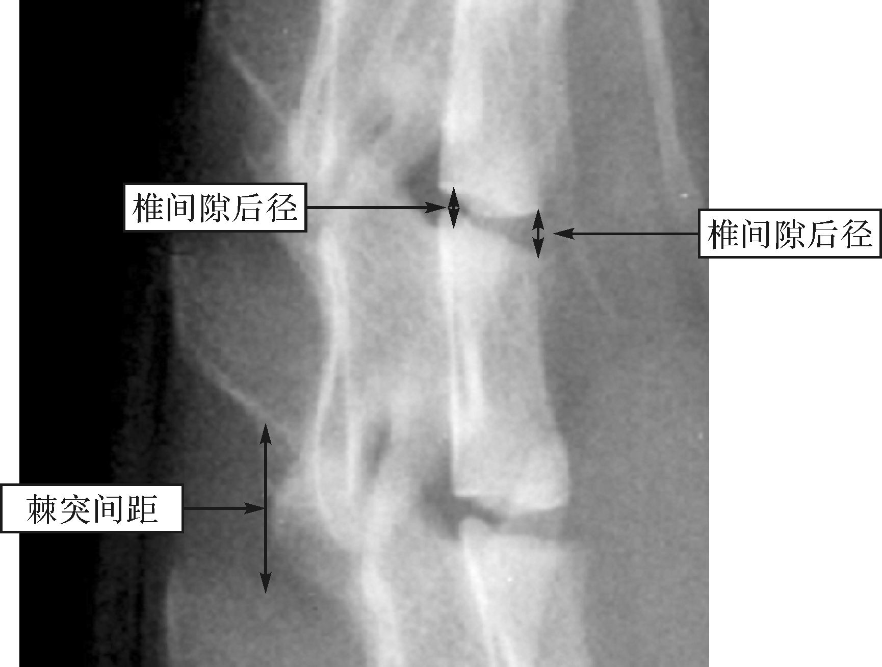 1.4 椎间隙前径、后径和棘突间距的测量每张图像测量腰椎L3-L4、L4-L5、L5-L6、L6-S1的椎间隙前径、后径和棘突间距。测量时做如下定义:以大鼠腹侧为前,大鼠背侧为后。椎间隙前径即大鼠相邻椎体关节面的前缘之间的最短距离,椎间隙后径即大鼠相邻椎体关节面的后缘之间的最短距离,棘突间隙即相邻棘突之间的最短距离。见图1。
