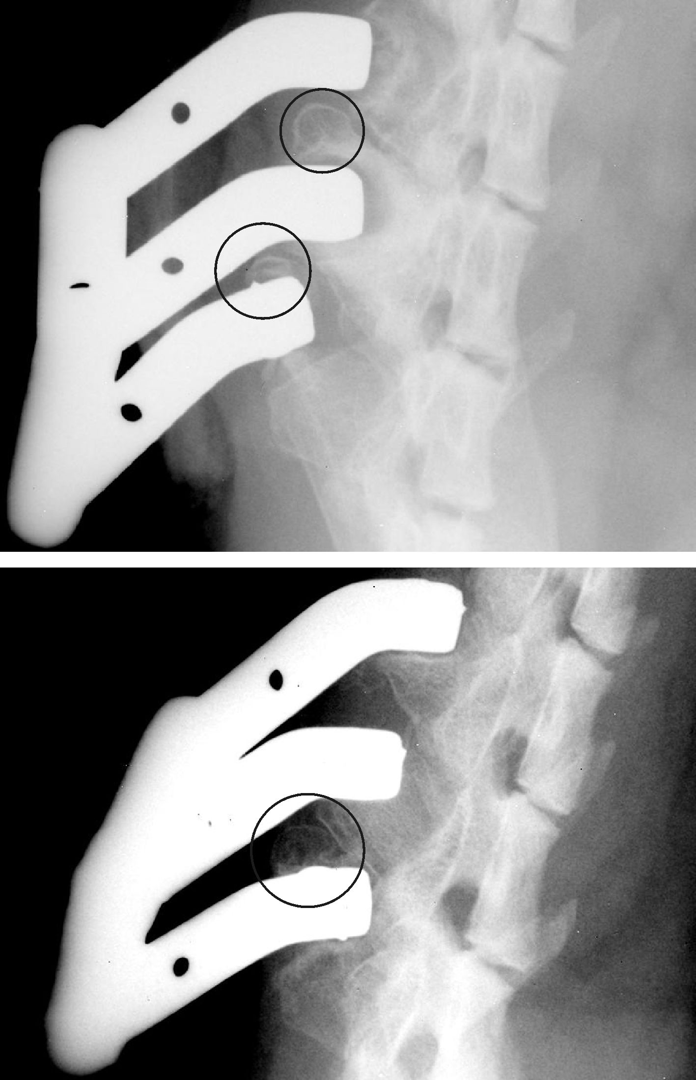 | 模型大鼠腰椎L4~L6节段植入椎体外部连接固定装置8周后骨赘形成明显(图中画圈处). 图2 大鼠腰椎造模节段骨赘形成示意图 Fig.2 Obvious osteophytes formation in lumbar vertebra of rat model |