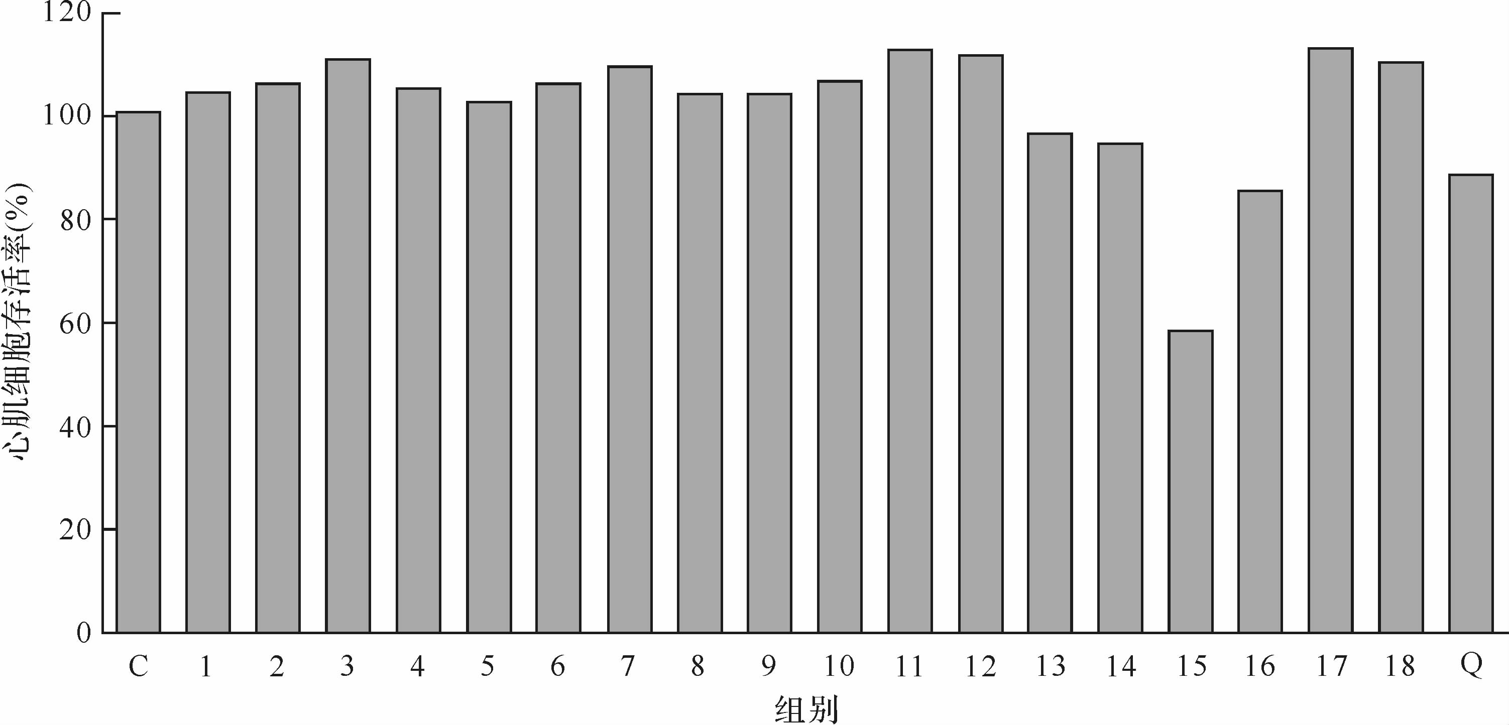 | C: 正常对照组;1~18:TM-1~18(50μg/mL); Q:槲皮素组(40μmol/L). 图1 通脉养心丸各组分的细胞毒性筛选结果 Fig.1 Cytotoxicity results of Tongmai Yangxin pill fractions (TM1-18 is called 1-18 for short) |