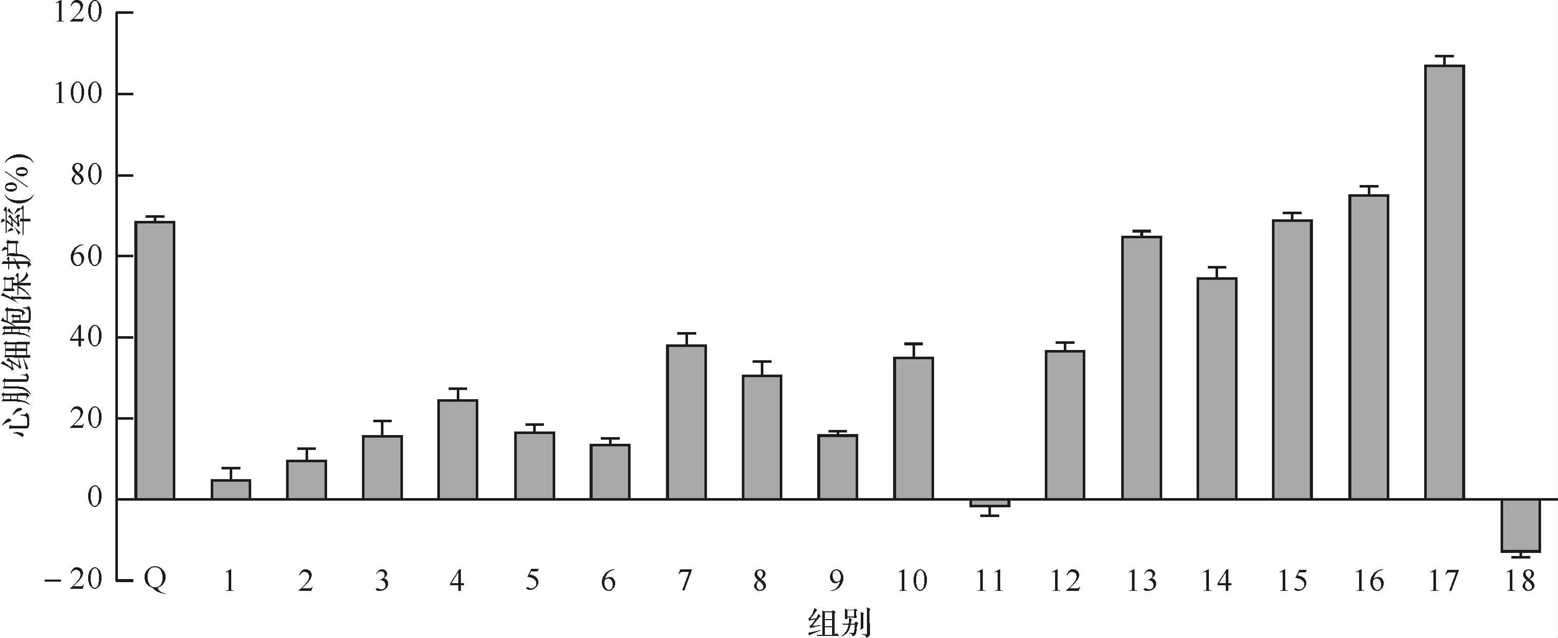 | Q:槲皮素组(40μmol/L); 1~18:TM-1~18(除TM-15为20μg/mL,其余均为50μg/mL). 图2 通脉养心丸各组分对心肌细胞保护率的影响 Fig.2 Myocardial protective activity screening results of Tongmai Yangxin pill fractions |