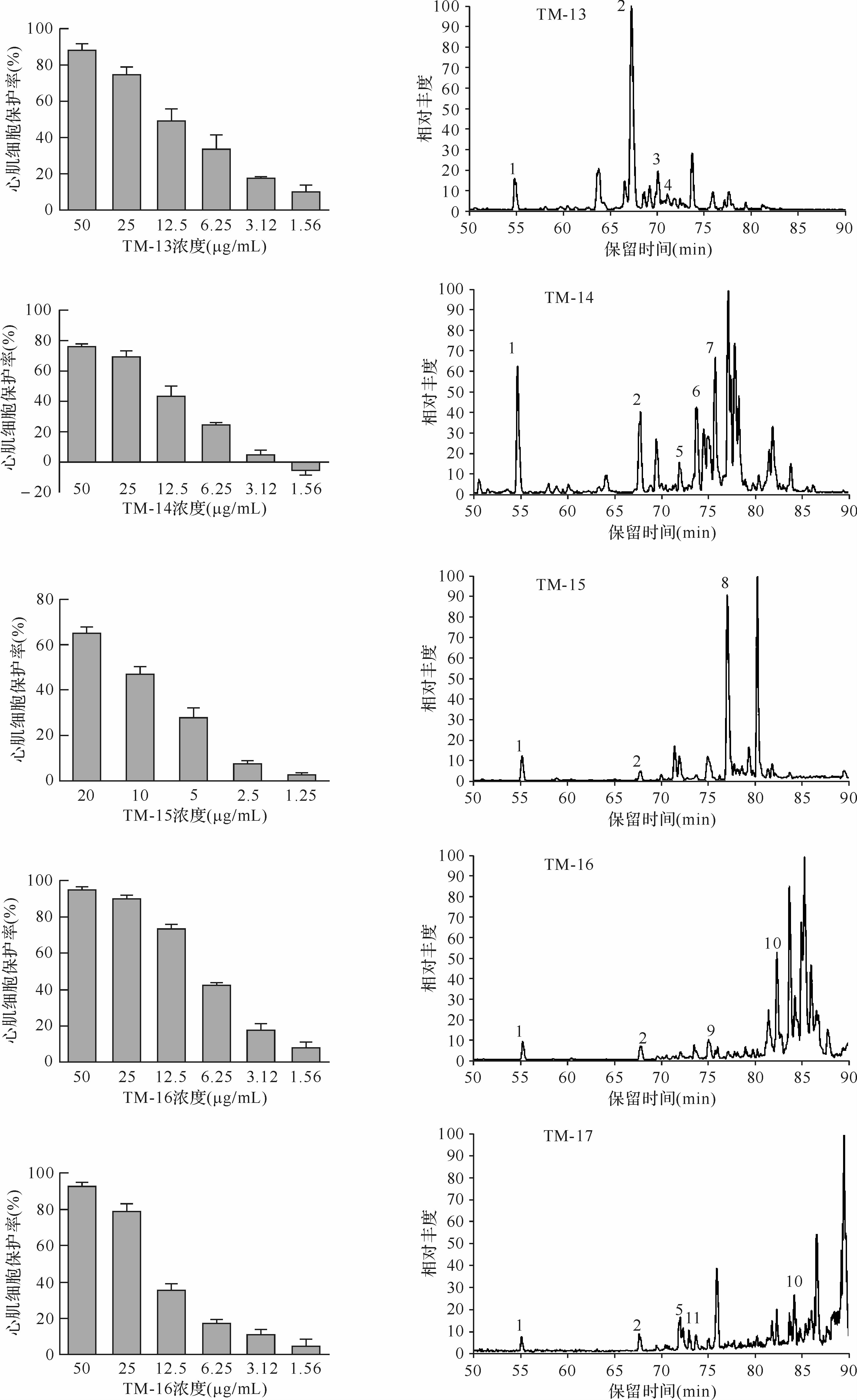 1.7 MTT法分析通脉养心丸心肌保护活性组分量效关系对通脉养心丸中相对细胞保护率在50%以上的组分(TM-13、TM-14、TM-15、TM-16、TM-17)进行心肌保护活性量效关系研究,方法同1.6。其中TM-13、TM-14、TM-16、TM-17的浓度分别为50、25、12.5、6.25、3.125、1.5625μg/mL,TM-15的浓度为20、10、5、2.5、1.25、0.625μg/mL。每个样品设3个复孔,重复3次实验,趋势一致情况下考察其心肌保护活性量效关系。