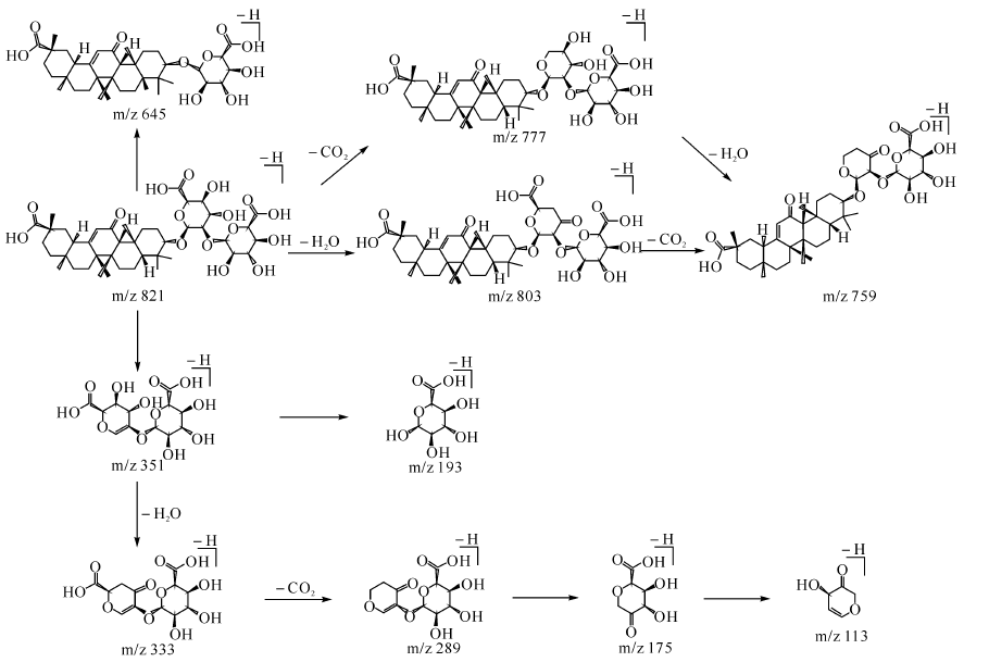 以峰1为例说明这些化合物的分析鉴定过程。峰1通过与标准品保留时间、紫外最大吸收以及二级质谱碎片等性质对比后,鉴定为甘草酸。下面分析其可能裂解途径。如图4所示,二级质谱碎片中易见到[M-18-H]-以及[M-44-H]-的碎片,应为丢失了一分子H2O和CO2的碎片离子。同时在二级质谱碎片中也观察到甘草酸逐步脱去葡萄糖醛酸的碎片离子,由此可以推断连接糖的数目。而m/z 351则是糖链部分形成的碎片离子,在二级质谱中是基峰,三级质谱中易见到其脱去H2O与CO2的碎片离子。