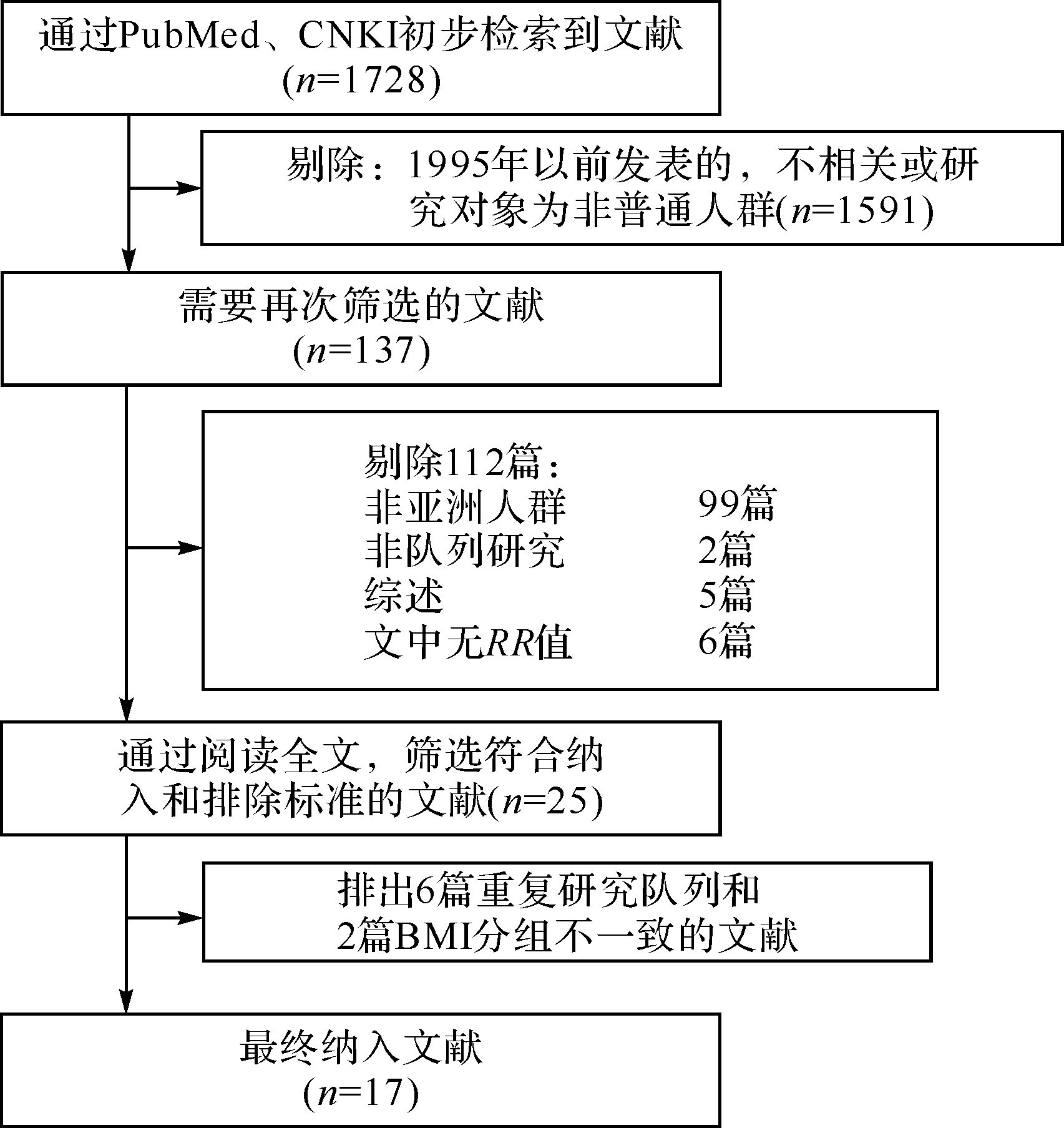 文献纳入标准如下:①在亚洲地区展开的研究;②以普通人群为研究对象的前瞻性研究,探讨BMI与人群全因死亡率的关系;③原始研究报告了各BMI组相对于对照组的相对危险度(Relative risk,RR)及95%可信区间(Confidence interval,CI),或者能提供数据估算RR及95%CI;④研究对象的年龄≥18岁,性别、种族不限;⑤当有两篇及以上文献报道同一队列时,纳入随访年限最长、最新的文献。