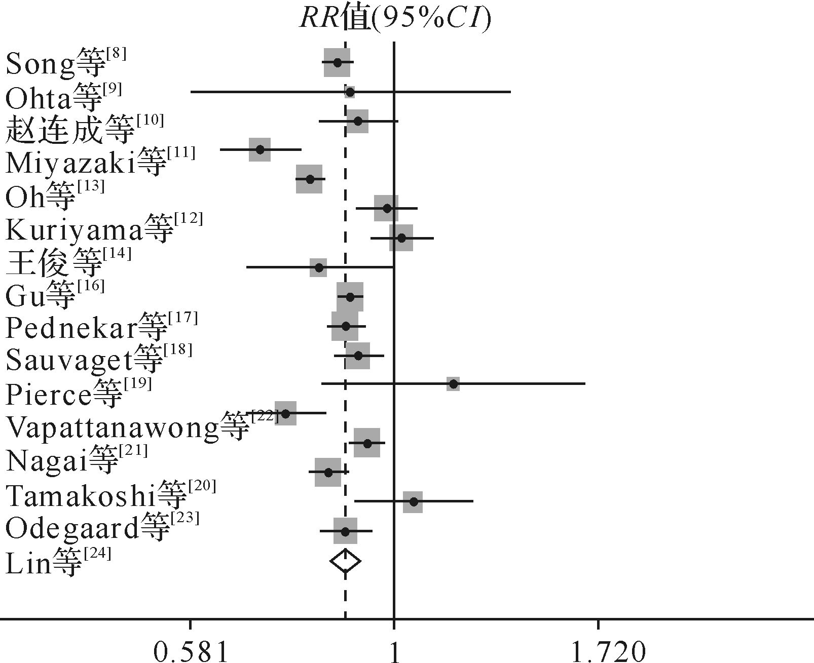 | 总体 | 16 | 1.39(1.31 ~1.47) | 0.000 | 90.4 | 17 | 0.88(0.85 ~0.92) | 0.000 | 81.7 | 13 | 1.14(1.05 ~1.23) | 0.000 | 90.9 | |||