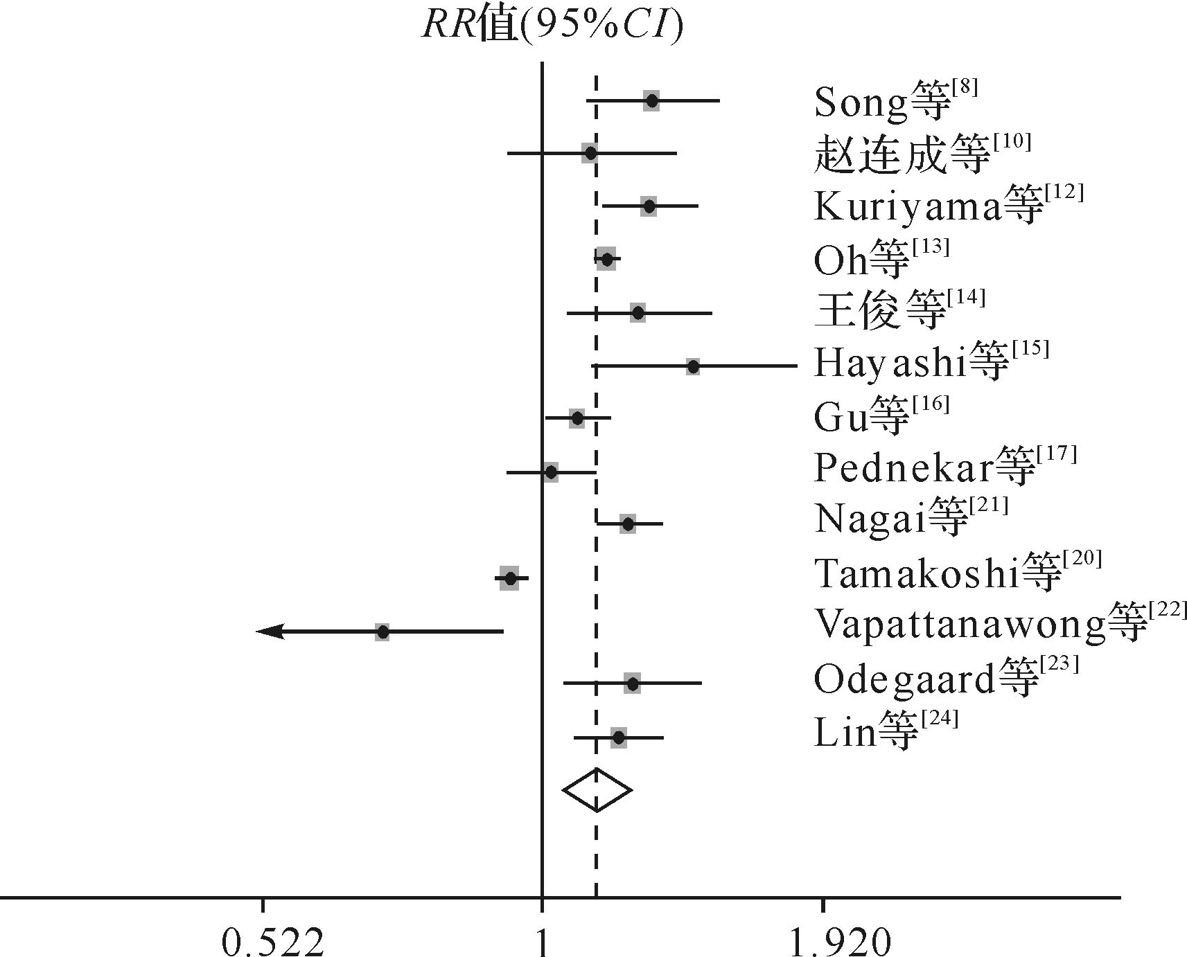 应用Stata 11.2软件进行RR值的合并及异质性检验。如果原始文献的参照组不一致,根据公式利用Stata软件计算变换参照后各BMI组的RR值及95%可信区间(CI)[6]。采用I2统计量评价原始研究间的异质性[7]。若I2<50%且P>0. 10采用固定效应模型分析;若I2>50%且P≤0. 10,提示多个同类研究的结果存在异质性,采用随机效应模型分析,并进行分层分析。