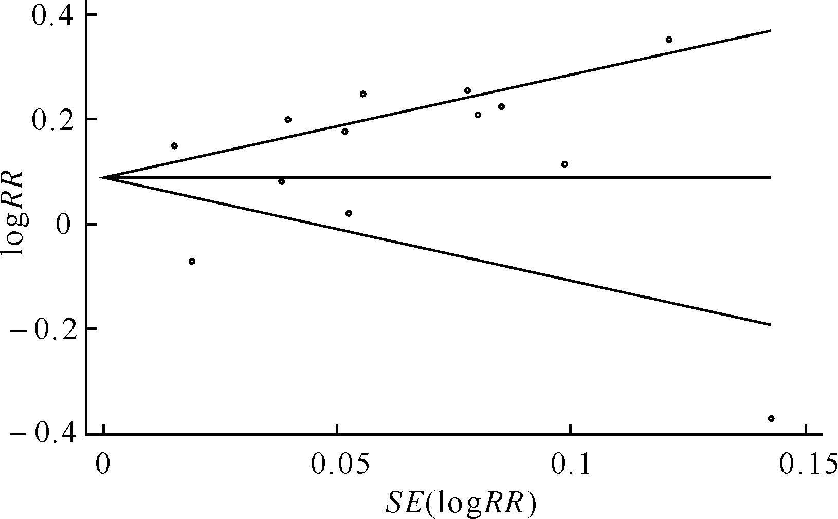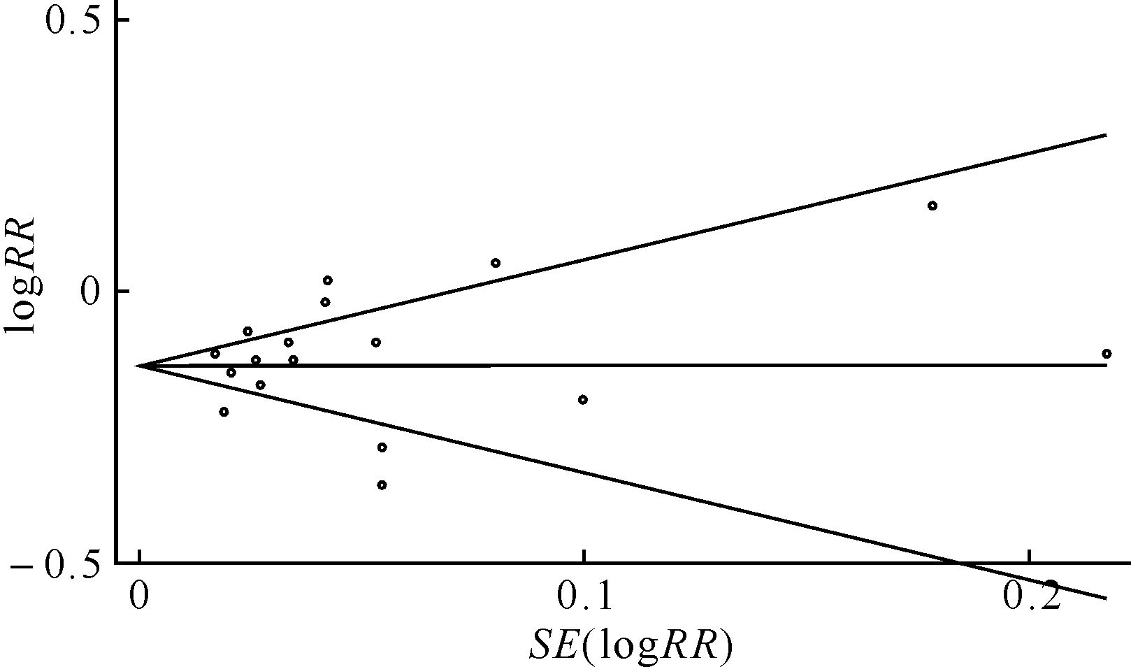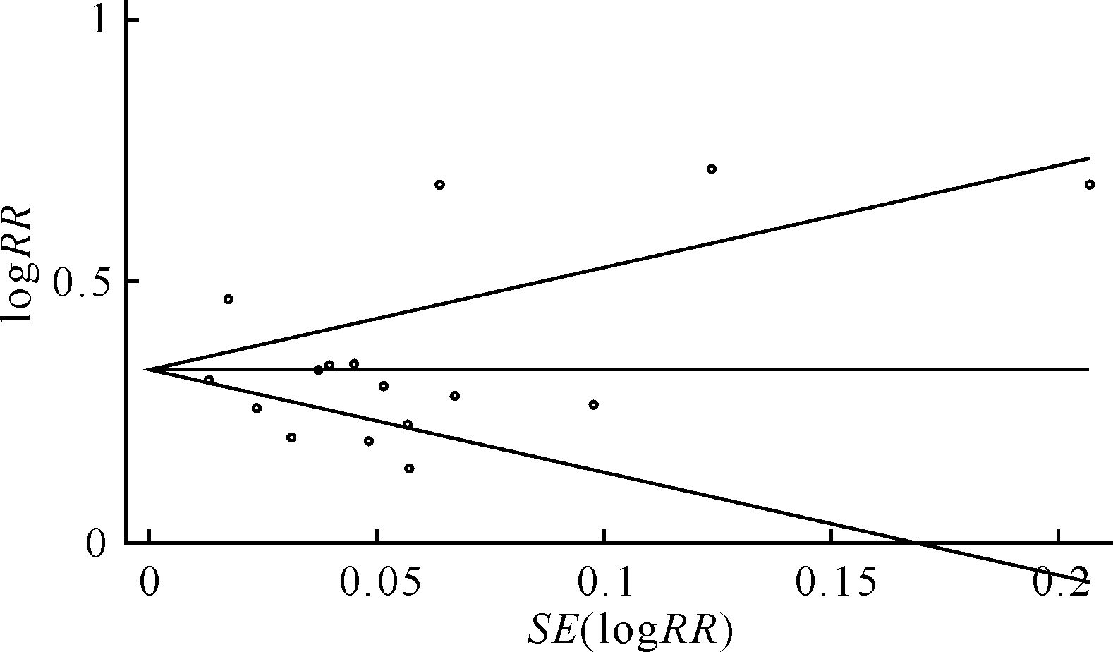 2.5 发表偏倚为了增加结果的可靠性,应用漏斗图,以logRR的标准误SE(logRR)值为横坐标,以logRR为纵坐标绘制漏斗图,再对漏斗图进行Begg检验以及Egger线性回归模型分析,结果Egger和Begg检验均未显示发表偏倚的存在(均P>0.05),漏斗图分析结果(图5~图7)显示基本对称。由此可见本次分析结果比较可靠。