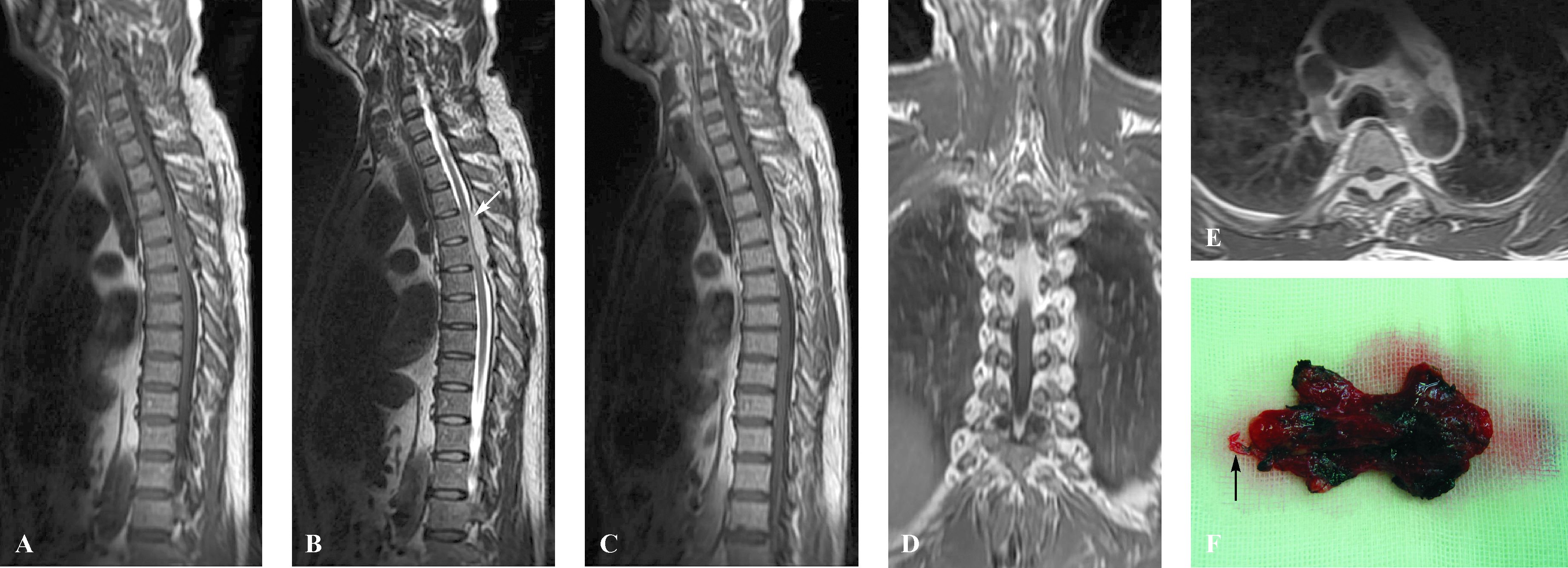 | A、B、C显示T3-6水平椎管后部硬脊膜外“长梭状”占位病变,其中A为胸椎矢状位(平扫),稍长T1信号; B为胸椎矢状位(平扫),稍长T2信号,可见肿瘤前方线状低信号的硬脊膜(白箭头所示); C为胸椎矢状位(增强),肿瘤注药后明显均匀强化,伴“鼠尾征”. D:胸椎冠状位(增强),肿块向两侧椎间孔延伸. E:胸椎轴位(增强),肿块呈“钳状”包绕压迫脊髓. F: 肿瘤标本大体观显示全切后的形态,尾部一条引流血管(黑箭头所示). 图1 单纯椎管内硬脊膜外海绵状血管瘤的MRI及大体表现 Fig.1 Pure spinal epidural cavernous hemangioma in a 55-year-old man |