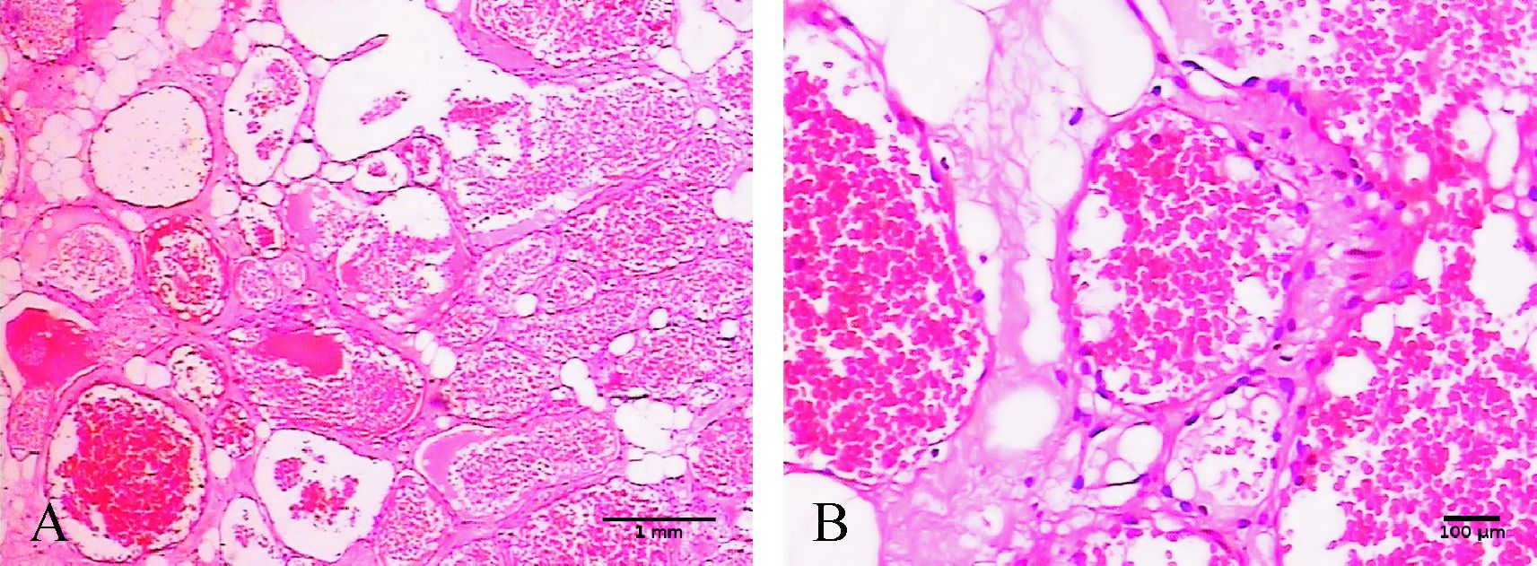 | 肿瘤组织由大小不等的扩张血管间隙构成,血管壁薄,内含大量红细胞. A:标尺=1mm ;B:标尺=100μm. 图2 切除的单纯椎管内硬脊膜外海绵状血管瘤组织显微镜下所见(HE染色) Fig.2 Photomicrograph of the surgical specimen (HE staining) |