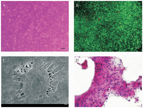 | A:光学显微镜下ROB呈长梭状.标尺=100μm. B:ROB绝大部分FDA/PI染色呈绿色.绿色为活细胞,红色为死细胞.标尺=100μm.C:扫描电镜可见ROB复合物通过突触依附于胶原材料,细胞与材料融合良好.标尺=1μm.D:HE染色结果,ROB在胶原水凝胶材料中分布均匀、细胞密度较高.标尺=50μm. 图 1 胶原水凝胶三维立体培养的ROB形态 Fig. 1 Morphology of three dimensional collagen hydrogel cultured ROB |
