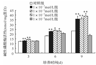 三维立体培养第3、6、9 天进行ROB碱性磷酸酶活性测定,结果发现,除1×10-4 mol/L组外,其余各组ROB的碱性磷酸酶活性均高于对照组,差异有统计学意义( 均P<0.05),其中以1×10-6 mol/L组ROB的碱性磷酸酶活性最高,故后续实验皆采用此浓度(图 2)。提示淫羊藿苷可以提高三维立体培养ROB的碱性磷酸酶活性。