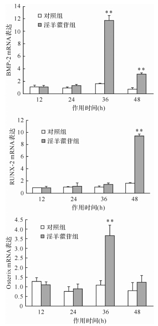 1×10-6 mol/L 淫羊藿苷处理三维立体培养ROB 36、48 h后,BMP-2 mRNA表达量均多于对照组(均P<0.01),其中36 h表达量更多;淫羊藿苷作用于ROB 48 h后,RUNX-2 mRNA的表达量多于对照组(P<0.01);淫羊藿苷作用于ROB 36 h后,Osterix mRNA的表达量也多于对照组(P<0.01),见图 3。提示1×10-6 mol/L 淫羊藿苷可以增加三维立体培养ROB的成骨性相关因子BMP-2、RUNX-2和Osterix mRNA的表达。