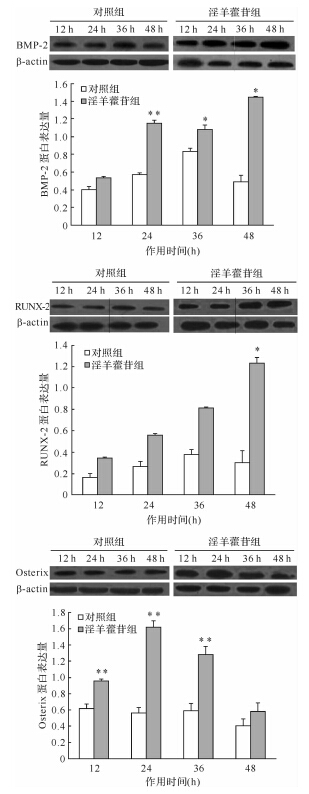 1×10-6 mol/L淫羊藿苷作用于ROB 24、36、48 h后,BMP-2蛋白表达量均多于对照组(均P<0.05);淫羊藿苷作用于ROB 48 h后RUNX-2蛋白表达量多于对照组(P<0.05);淫羊藿苷作用于ROB 12、24、36 h后,Osterix蛋白的表达量也多于对照组(均P<0.01),见图 4。提示1×10-6 mol/L 淫羊藿苷可以提高三维立体培养ROB的成骨性相关因子BMP-2、RUNX-2和Osterix蛋白的表达。