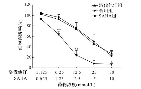 | 与SAHA组相应浓度比较,*P<0.05;**P<0.01. 图1 不同剂量SAHA与洛伐他汀合用对A549细胞存活率的影响 Fig.1 The effect of SAHA and lovastatin in combination on the viability of A549 cells |