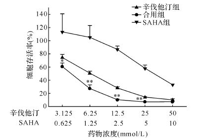 | 与SAHA组相应浓度比较,*P<0.05,**P<0.01. 图2 不同剂量的SAHA与辛伐他汀合用对A549细胞存活率的影响 Fig.2 The effect of SAHA and simvastatin in combination on the viability of A549 cells |