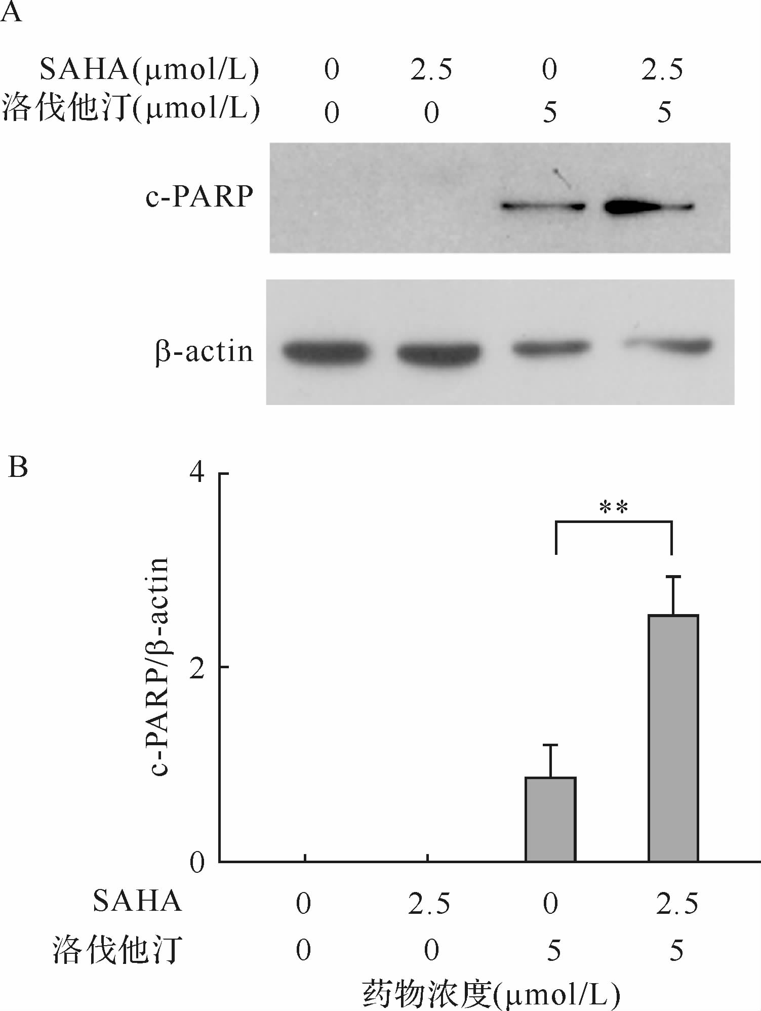 2.4 洛伐他汀与SAHA合用对A549细胞c-PARP蛋白表达的影响PARP蛋白的剪切是细胞凋亡的一个重要指标。为了进一步验证两药合用对A549细胞凋亡的影响,将2.5 μmol/L SAHA与5 μmol/L洛伐他汀单独或共同作用于A549细胞48 h,检测c-PARP蛋白的表达情况。如图3所示,合用组c-PARP表达较洛伐他汀组增加(P<0.01)。提示洛伐他汀能协同增强SAHA对A549的凋亡诱导作用。