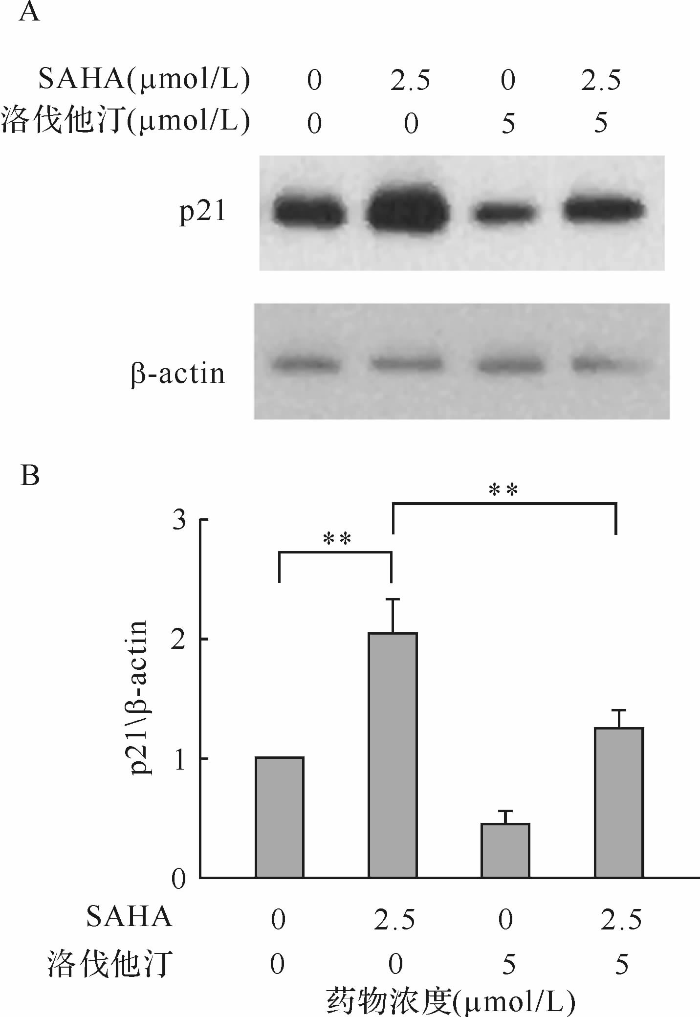 SAHA能上调A549细胞周期调控蛋白 p21的表达水平;当洛伐他汀与SAHA合用时A549细胞p21蛋白表达下调(均P<0.01),见图4。该结果提示,洛伐他汀协同SAHA抑制人非小细胞肺癌细胞可能与p21蛋白的表达水平相关。