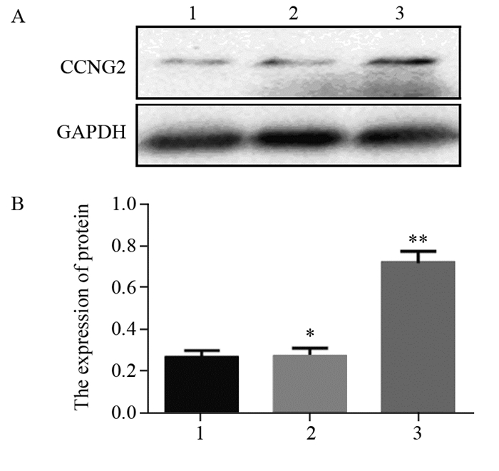 | 1: blank control group; 2: negative control group; 3: cells transfected with CCNG2; **: P < 0.05, compared with blank control and negative control group; *: P > 0.05, compared with blank control group 图 1 Western blot检测各组PTC K1细胞CCNG2蛋白表达情况 Figure 1 Expression of CCNG2 protein in each group of PTC K1 cells detected by Western blot |