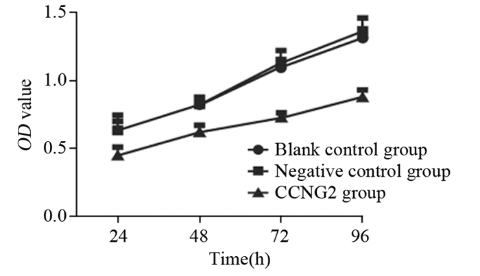 1.3 MTT比色法检测细胞增殖取对数生长期的K1细胞,以每孔100 μl约1×105个细胞的密度接种于96孔板。实验分组:实验组(转染CCNG2基因质粒组)、阴性对照组(转染空载质粒)、空白对照组(未转染组)。分别于转染24、48、72、96 h时取出相应的96孔板,加入MTT溶液(5 mg/ml)10 μl,37℃反应4 h。吸弃各孔中培养液,每孔加入DMSO 100 μl,充分振荡溶解结晶。酶标仪检测吸光度值(A值),检测波长为490 nm,调零孔设定为加DMSO不加细胞的孔。测得各组3个A值取均数表示细胞的增殖情况,并绘制生长曲线,计算生长抑制率。生长抑制率(%)=(A值空白对照组-A值实验组)/A值空白对照组×100%。上述实验至少重复三次。