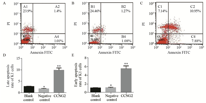 | A: blank control; B: negative control; C: cells transfected with CCNG2; D: the late apoptosis of K1 cells; E: the early apoptosis rate of K1 cells; **: P < 0.05, compared with blank control and negative control group; *: P > 0.05, compared with blank control group 图 3 FCM检测48 h后各组PTC K1细胞早期凋亡与晚期凋亡情况 Figure 3 Late and early apoptosis rates of PTC K1 cells in each group after 48 h detected by FCM |