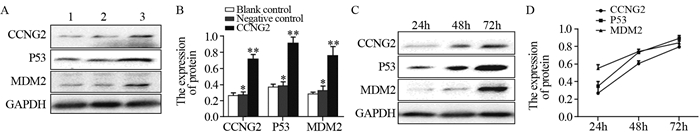 分别于转染CCNG2 24、48、72 h后检测CCNG2、P53、MDM2蛋白表达情况,随时间增加CCNG2蛋白相对表达量增加(0.27±0.08)、(0.61±0.03)、(0.80±0.07),各时间点蛋白相对表达量差异有统计学意义(P=0.000),P53及MDM2蛋白相对表达量分别随时间增加而升高,与CCNG2蛋白表达升高具有一致性,见图 4C、D。