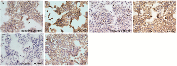 | A: the expression of CCNG2 protein; B: the expression of P53 protein; C: the expression of MDM2 protein 图 5 免疫细胞化学染色法检测各组PTC K1细胞CCNG2、MDM2和P53蛋白表达(×400) Figure 5 Expression of CCNG2, MDM2 and P53 protein in each group of PTC K1 cells detected by immunohistochemistry (×400) |