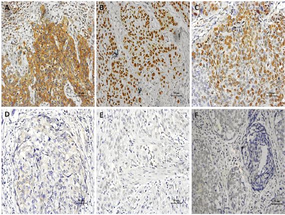 | A-C: positive expression,D-F: negative expression; A,D:expression of Nm23; B,E: expression of p53; C,F:expression of PCNA 图 1 Nm23、p53和PCNA在进展期胸段食 管鳞癌患者中的表达(×200) Figure 1 Positive expression and negative expression of Nm23,p53 and PCNA(×200) |