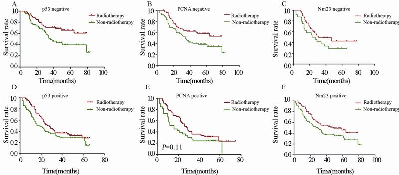 | A-C:negetive expression of p53,PCNA and Nm23; D-E:positive expression of p53,PCNA and Nm23 图 3 术后辅助放疗对PCNA、p53和Nm23阴性和阳性表达患者的生存影响 Figure 3 The impact of adjuvant radiotherapy on the prognosis of patients with negative and positive expression of PCNA, p53 and Nm23 |