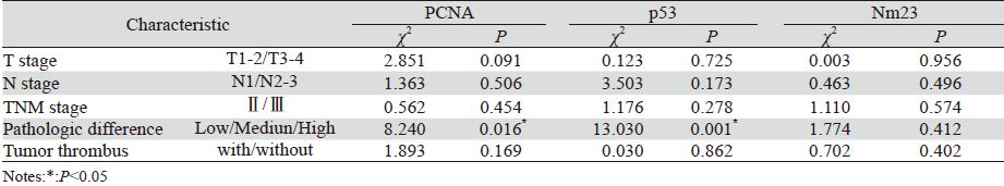 PCNA与p53的表达水平均与肿瘤细胞病理分级密切相关;分化程度越差,PCNA和p53阳性表 达率越高。Nm23的表达与临床病理因素无明显相 关性,见表 1。