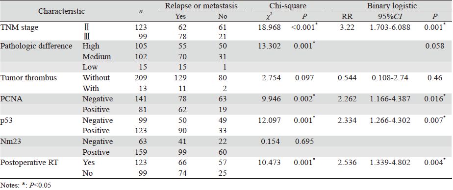 Chi-square检验显示PCNA阳性、p53阳性、 肿瘤分化差、分期晚以及未辅助放疗的进展期胸 段食管鳞癌患者术后的复发或远处转移率明显提 高。Binary多因素分析显示PCNA、p53表达、肿瘤 分期和辅助放疗是影响进展期胸段食管鳞癌患者 术后局部复发或远处转移的独立因素,病理分级 和脉管癌栓间未达统计学意义,见表 2。