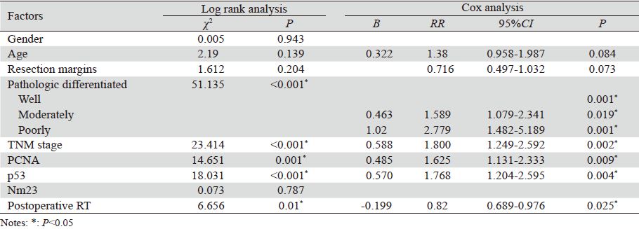 全组3、5年生存率分别为45.8%、40%。中 位生存期为33月。Ⅱ、Ⅲ期患者5年生存率分别 为51.8%和25.1%(Ρ<0.001)。术后放疗组和单 独手术组患者5年生存率分别为45.3%和33.6% (Ρ=0.01)。高、中、低分化组患者5年生存率 分别为54.9%、29.8%和0%(Ρ<0.001)。p53阴 性和p53阳性患者5年生存率分别为54.3%和28.9% (Ρ<0.001)。PCNA低表达和PCNA高表达组患 者5年生存率分别为48.7%和22.8%(Ρ=0.001)。 Log rank单因素分析显示PCNA表达、p53表达、术 后放疗、肿瘤病理分级和TNM分期是影响进展期 胸段食管鳞癌术后患者总生存率的预后因素,而 性别、年龄、发生部位和Nm23表达不影响预后。 Cox多因素分析显示PCNA表达(Ρ=0.009)、p53 表达(Ρ=0.004)、术后放疗(Ρ=0.025)、病理分 级(Ρ=0.001)和TNM分期(Ρ=0.002)是影响进展 期胸段食管鳞癌患者术后总生存率的独立预后因 素,见图 2、表 3。