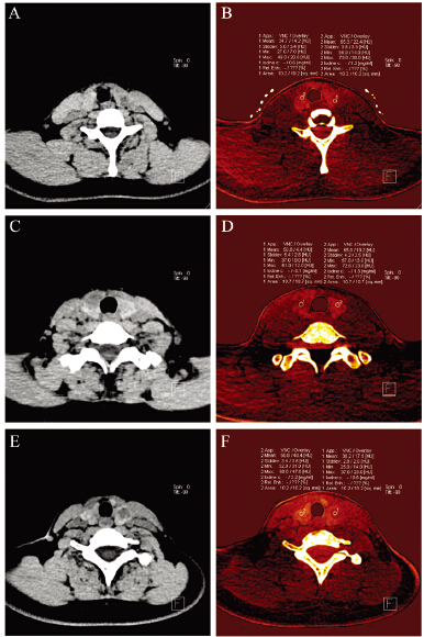 | A,B: Female,32 years old,left thyroid nodule(adenoma) border was clear,the density was not homogeneous. Iodine was 0.6mg/ml; C,D: Male,46 years old,right thyroid nodule(papillary carcinoma) border was not clear,the density was not homogeneous. Iodine was -0.1mg/ml; E,F: Female,30 years old,left thyroid nodule(papillary carcinoma) border was not clear,the density was not homogeneous. Iodine was 0.6mg/ml 图 1 患者甲状腺结节CT及碘值 Figure 1 The CT attenuation value and iodine concentration of thyroid nodules |