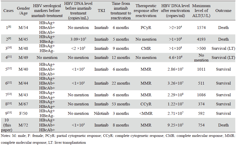 男,72岁,2012年5月确诊CML(慢性期), BCR-ABL融合基因阳性(P210)。既往慢性乙 型病毒性肝炎病史20余年,未曾治疗。入院查 ALT、AST正常,HBsAg、HBeAb、HBcAb阳 性,HBV-DNA定量<103 copies/ml,腹部B型超声 示肝脏形态正常,脾大。给予患者口服伊马替尼 400 mg/d治疗,用药3月后获得主要分子生物学 反应(MMR),6月后获得完全分子生物学反应 (CMR)。患者用药期间(2012.5—2013.3)每 2月检测肝功能均正常。2013年4月,患者开始出 现乏力、腹胀、纳差、尿黄、肤色发黄,ALT 754 u/L,AST 961.9 u/L,TBIL 397.4 μmol/L,凝血功 能示PT 52.6 s,腹部B型超声示肝脏体积缩小, 胞膜欠光滑,门静脉内径1.4 cm,腹盆腔积液, HBsAg、HBeAb、HBcAb阳性,HBV-DNA定量 9.25×105 copies/ml,HAV、HCV、HEV、CMV、EBV病毒筛查均无现症感染证据。该患者出现的 重症肝炎考虑为乙肝病毒再激活后导致的肝功能 损害。立即停用伊马替尼,加用恩替卡韦联合阿 德福韦酯抗病毒治疗,同时予保肝、退黄、输注 新鲜血浆等支持治疗,但患者肝功能损害病情进 行性恶化,3周后死亡。 2 讨论