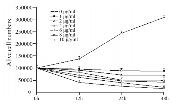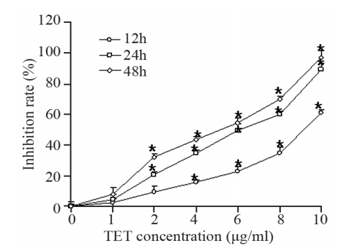 PC3细胞以1×105个/孔的密度铺于24孔培养板,待细胞贴壁生长,更换培养液,分别加入含不同浓度(0、1、2、4、6、8、10 µg/ml)TET的DMEM培养液,每个浓度作三个复孔,显微镜下观察细胞生长的变化,分别于12、24、48 h后收获不同条件下培养的细胞,以0.4%锥虫蓝染色,用血细胞计数板计活细胞数,取四个象限未蓝染的细胞平均数作PC3细胞的生长曲线。1.2.3 MTT法测定增殖反应