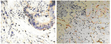 VEGF-C阳性表达中Podoplanin阳性表达率为73.3%(22/30),VEGF-C阴性表达中Podoplanin阳性表达率为34.3%(11/32),差异有统计学意义(p=0.02)。直肠癌组织中VEGF-C表达阴性者,LMVD是(13.2±2.4);而VEGF-C表达阳性者,LMVD是(29.1±2.6),两者差异有统计学意义(p=0.03)。